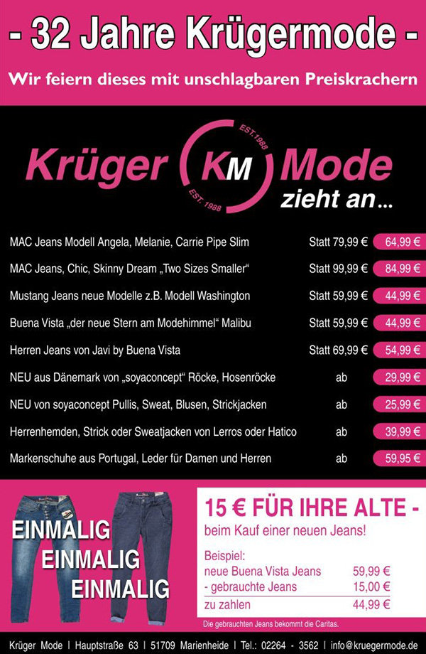 Marienheide - Mode, die „anzieht“, Spaß macht und erschwinglich ist - Ganz unter diesem Motto bietet Krüger Mode allen Kunden ein breites Sortiment für die ganze Familie - Tolle Angebote zum Ende des Jubiläumsjahres.