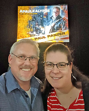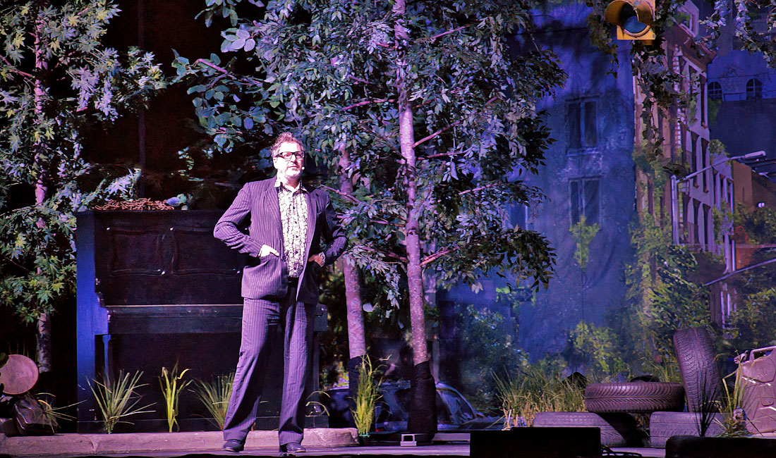 Und was für ein Spaß es war, dem gefeierten TV-Komiker zuhören zu dürfen, wenn er sich beispielsweise über „vegane“ Wurst ausließ. Etwa, warum sich die vegane und vegetarische Werbung immer noch der „echten Wurst“ bedienen würde. Es würde doch ganz einfach gehen: „Hirsestange statt Schinkenspicker.“ Paul Panzer nahm das Publikum an die Hand, mit in die Strahlungszone menschlicher Dummheit und lehrte allen die große Freude am Weltuntergang. Weltuntergangsstimmung sollte auch das dystopisch anmutende Bühnenbild verbreiten, als eine Art Endzeitszenario mit sehr dezentem Licht.