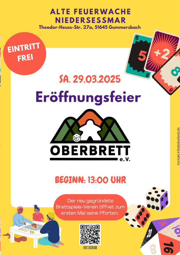 Mit dem „Oberbrett e.V.“ geht der erste Brettspieleverein in der Region an den Start. Am kommenden Samstag, 29. März, findet die erste offene Veranstaltung in der ehemaligen Feuerwache in Gummersbach-Niederseßmar (Theodor-Heuss-Straße 27a) statt. Bei freiem Eintritt ist ab 13 Uhr jeder Interessierte willkommen. Es werden Spiele aller Art und mit verschiedenen Schwierigkeitsstufen angeboten. Kaffee und Kuchen gibt es für kleines Geld. Künftig sollen regelmäßige Spieletreffen veranstaltet werden.