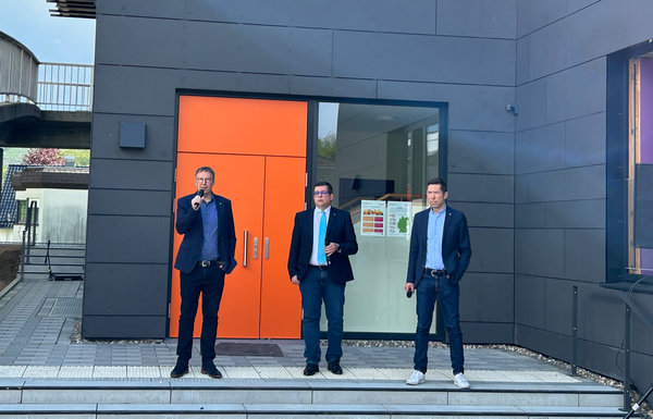 [Die Vertreter der Stadt Gummersbach vor dem kernsanierten Zentrum: Jürgen Hefner (Technischer Beigeordneter, v.li.), Bürgermeister Frank Helmenstein sowie Stadtkämmerer Raoul Halding-Hoppenheit.]