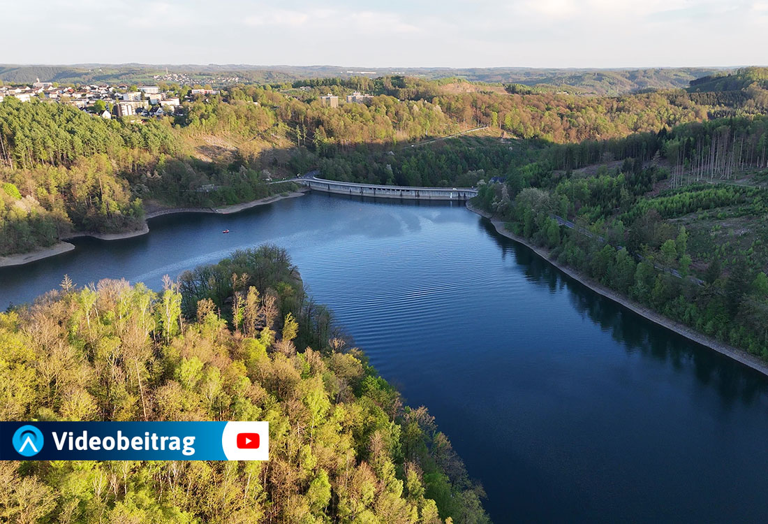 Bei traumhaftem Frühlingswetter entstand am Samstagabend diese stimmungsvolle Aufnahme: Der Drohnenflug fängt die Abendatmosphäre über der Aggertalsperre ein – Naturidylle pur.