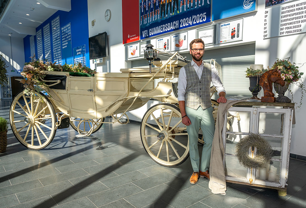 [Bastian Ufer vom Ferienhof Biesenbach zeigte eine Hochzeitskutsche.]