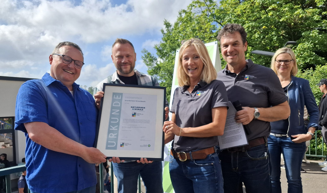 Eine neue Urkunde wird ab sofort den Eingangsbereich der Gemeinschaftsgrundschule Hülsenbusch schmücken, denn sie darf sich erneut „Naturpark-Schule“ nennen. Sie hat dieses bundesweite Zertifikat vom Verband Deutscher Naturparke (VDN) erneut erhalten. Die Urkunde wurde heute im Rahmen einer Feierstunde von Jens Eichner, Geschäftsführer des Naturparks Bergisches Land an den Schulleiter, Edgar Prinz, überreicht.