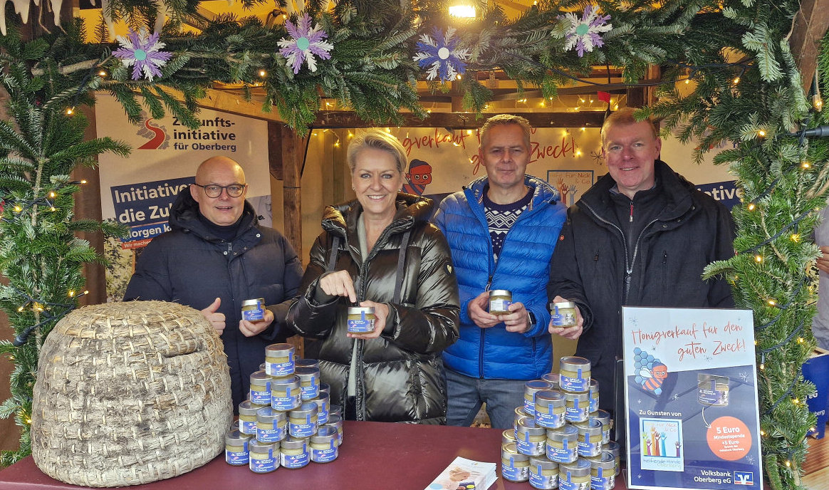 Am zweiten Advent standen Mitarbeiter der Niederlassung Gummersbach im Winterdorf und verkauften den Honig der eigenen Volksbank-Bienenvölker für mindestens fünf Euro pro Glas. Die Volksbank Oberberg legte jeweils weitere fünf Euro obendrauf. So kamen insgesamt 2.500 Euro für schwer kranke Kinder aus der Region zusammen.