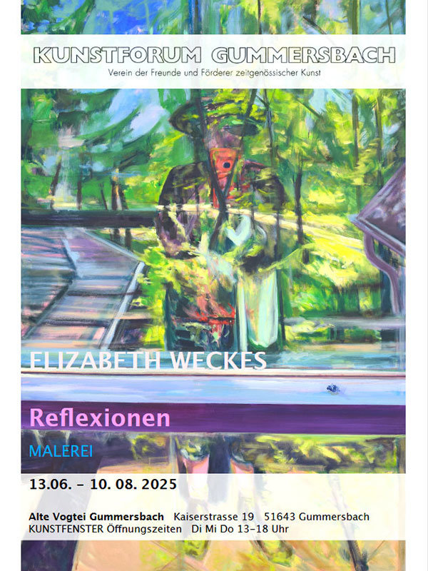 Zur Eröffnung der Kunstvorstellung von Elizabeth Weckes am Freitag, 13. Juni, ab 18 Uhr, in der Guten Stube der Alten Vogtei lädt das Kunstforum Gummersbach ein. Die Werke werden bis 10. August zu sehen sein.