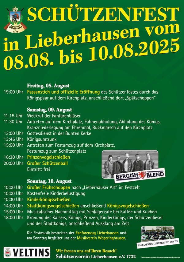 Der Schützenverein Lieberhausen feiert vom 8. bis 10. August sein Schützenfest. Es beginnt am Freitag um 19 Uhr mit dem Fassanstich auf dem Kirchplatz durch das amtierende Königspaar. Der Schützenfest-Samstag wird eröffnet vom Fanfarenzug Lieberhausen mit dem Weckruf um 11:15 Uhr und endet mit dem Schützenball am Abend. Am Sonntag ab 10 Uhr findet der Frühschoppen nach „Lieberhäuser Art“ statt und ab 18 Uhr werden die neuen Majestäten gekrönt. Zudem ist der Schützenverein Lieberhausen in diesem Jahr Ausrichter des Stadtkönigsvogelschießens, da man mit Stefan Henn den amtierenden Regenten stellt.
