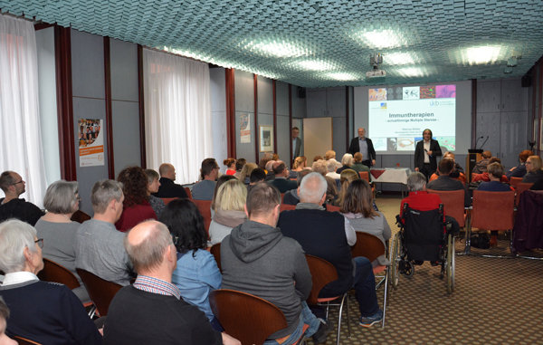 Für die Betroffenen hatte Dr. Marcus Müller einen Überblick mit den Medikamenten für die schubförmig verlaufende MS zusammengestellt. Dabei stellte der Leiter der MS-Ambulanz an der Uniklinik Bonn Wirkungen und Nebenwirkungen der Präparate dar. Anschließend informierte Dr. Christine Bindler, Oberärztin der Neurologie am Kreiskrankenhaus Gummersbach, über die neuen Immuntherapien. Außerdem wurden die Rehabilitationsmaßnahmen von Dr. Andreas Sackmann von der Celenus-Klinik Hilchenbach vorgestellt und zeigte, wie man besser mit MS umgehen kann. Denksportaufgaben und Bewegungsübungen brachte Sabine Vogel, Diplom-Pflegewirtin am Universitätsklinikum Gießen mit. Anschließend informierte Blaes über Impfungen bei MS.