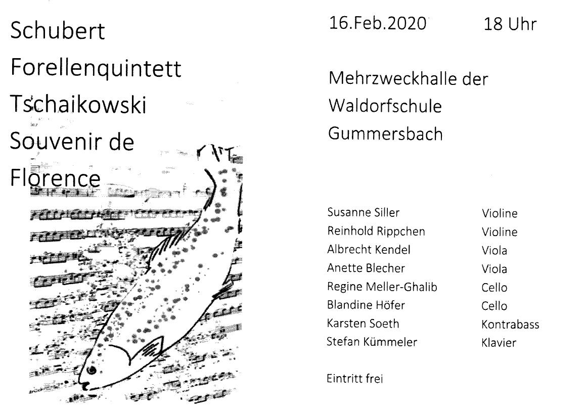Franz Schuberts "Forellenquintett" und Tschaikowskis Sextett „Souvenir de Florence“ sind zwei fröhliche Kammermusikwerke, die am Sonntag, den 16. Februar ab 18 Uhr, in der Mehrzweckhalle der Freien Waldorfschule Oberberg (Kirchhellstraße 32, 51645 Gummersbach) erklingen werden. Ausführende sind: Violinen - Susanne Siller, Reinhold Rippchen Violen - Anette Blecher, Albrecht Kendel Celli - Regine Meller-Ghalib, Blandine Höfer Kontrabass - Karsten Söth Klavier - Stephan Kümmeler. Der Eintritt ist frei.