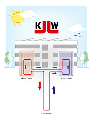 Durch eine Kombination aus Erdbohrung und Wärmepumpe, macht sich K+W die Temperaturbeständigkeit des Erdreiches mit einer ganzjährigen Temperatur von etwa 8-10°C zunutze. Über die Wärmepumpe wird Sole in rund 80 Meter Tiefe geleitet, dort durch die Erdtemperatur heruntergekühlt und von dort weiter an das Kühlsystem der K+W Server geleitet. Die kalte Sole kühlt die Server herunter und wird durch die Abwärme gleichzeitig aufgeheizt, um dann als Wärmequelle die Wärmpumpe einzuspeisen. Diese versorgt den Heizkreislauf der Fußbodenheizung im gesamten Gebäude. „Mit dieser Kombination schaffen wir nicht nur eine hervorragende und nahezu klimaneutrale Klimatisierung unserer Server und wenn nötig auch der Büroräume, sondern versorgen gleichzeitig den gesamten Neubau mit Wärme. Dadurch erreichen wir eine maximale Energieeffizienz“, freut sich Oliver Königs.