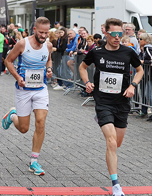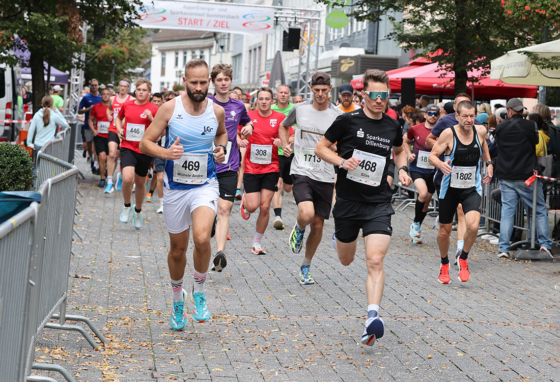 Im Hauptlauf über zehn Kilometer gab es eine Überraschung: Silas Becker vom TV Haiger nutzte den Stadtlauf als Formtest für den Frankfurt-Marathon und siegte in starken 34:36 Minuten. Lokalmatador Michel Krüger von der LG Gummersbach, der in den letzten Wochen bereits mehrere regionale Rennen gewinnen konnte (zuletzt den Wipperfürther Stadtlauf am Freitag), musste sich nach beherztem Beginn mit Rang zwei (35:34) zufriedengeben. „Nach sechs Kilometern ging es bei mir nicht mehr – da war gegen Silas nichts zu machen. Hut ab vor seiner Leistung“, so Krüger nach dem Rennen.