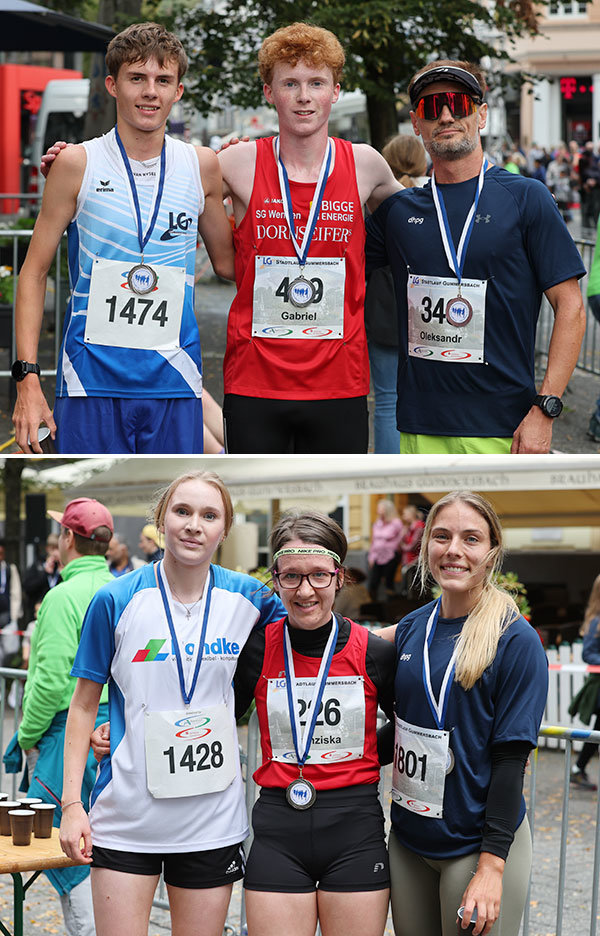 [Die Sieger über die vier Kilometer: Gabriel Niklas (Mitte) gewann bei den Männern vor Oleksandr Zaytsev (re.) und Benedikt Flosbach (oberes Bild); Franziska Dziallas (Mitte) siegte bei den Frauen vor Jana Pregler (1801) und Elisa Fiedler.]