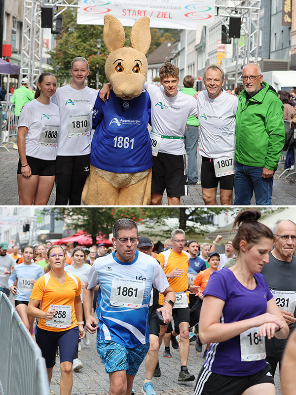[AggerEnergie-Chef Uwe Töpfer (re.) freut sich gemeinsam mit VfL-Maskottchen „Gummi“ über die Teilnahme seiner Mitarbeiter am Volkslauf (oberes Bild); der scheidende Gummersbacher Bürgermeister Frank Helmenstein wollte es über die zehn Kilometer noch einmal wissen.]