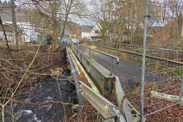 Ebenfalls keine Zukunft hat die Brücke an der Mühlwiese in Derschlag, die die Straße „An der Mühlwiese“ mit der Klosterstraße verbindet. Auch hier hat die letzte Hauptprüfung ergeben, dass die Brücke nicht mehr standsicher ist. Aufgrund ihrer Bauweise ist die Brücke zudem nicht sanierungsfähig. Ein Neubau würde etwa 800.000 Euro kosten. Im Rathaus sieht man keinen Verlust beim Abriss der Brücke und empfahl einen ersatzlosen Rückbau. Schüler können mit einem minimalen Umweg über die gut ausgebauten Fußgängerwege entlang der Klosterstraße weiterhin ungefährdet – und ohne Querung der viel befahrenen Straße - zum Busbahnhof in Derschlag gelangen.