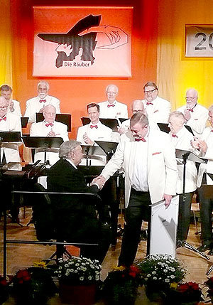 Trautner erinnerte an unvergessene Rundfunk-und Fernsehauftritte, an Chorreisen durch ganz Europa und Russland und erwähnte die Einspielung von sage und schreibe 23 Tonträgern, die der Chor unter Antons Leitung produzierte: „Die Räuber sind ohne Sie schwer vorstellbar, wir sind Ihnen zutiefst dankbar". Für seine achtbaren, langjährigen Verdienste für den Verein ernannte der Vorsitzende den Dirigenten zum Ehrenchorleiter. Der Geehrte legte dem Bürgermeister die Wiederbelebung des Theaters ans Herz und dankte neben den singenden Räubern deren Begleitern, Freunden und dem Vorstand. Seinen besonderen Dank richtete er an Sigrid Althoff, die sich als Klavierbegleiterin par excellence seit 1992 als Glücksfall für den Chor erwiesen habe.