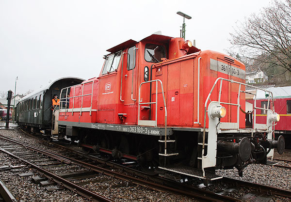 Obwohl die vereinseigene Dampflok „Waldbröl“ noch in der Hauptuntersuchung steckt und die Wiehltalbahnstrecke weiterhin gesperrt ist, wollten die Eisenbahnfreunde nicht auf das traditionelle Nikolauswochenende verzichten. Statt durchs Wiehltal fuhr der „Nikolaus-Express“ diesmal mit der historischen Diesellokomotive der Baureihe V 60 über Gummersbach nach Meinerzhagen.