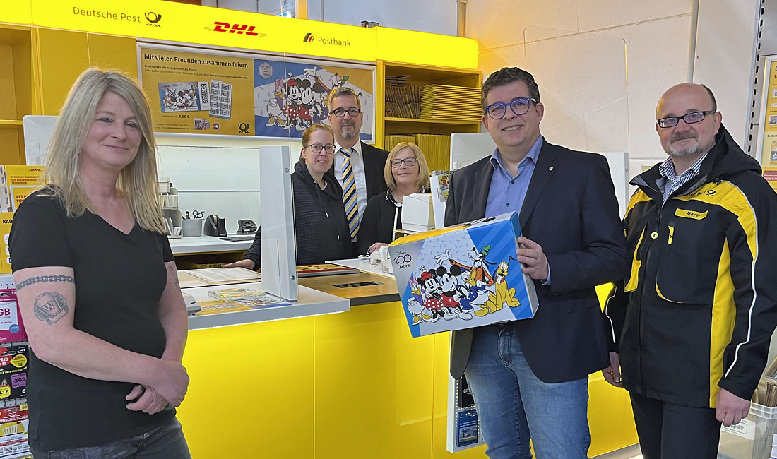 --- Zuer Eröffnung schaute auch Bürgermeister Frank Helmenstein vorbei (2.v.re), zudem auf dem Bild: Sandra Clement aus der Geschäftsführung von Mike’s Bikershop (v.li.), Filialmitarbeiterin Ann-Kathrin Steinhilb, Hans-Dieter Pupp (Vertriebsmanager der Deutschen Post), Filialmitarbeiterin Frauke Helzer-Wetzel, und Peter Mayer (Regionaler Politikbeauftragter der Deutschen Post).