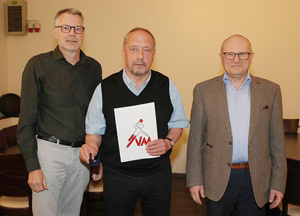 [Hartmut Markeli (Mitte) erhielt vom HNR-Präsidenten Stefan Butgereit (li.) und dem letzten HVM-Präsidenten Lutz Rohmer die Goldene Ehrennadel des Westdeutschen Handballverbandes.]