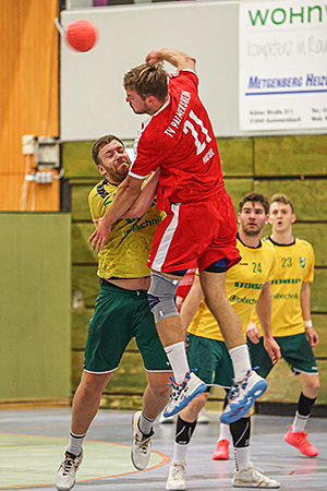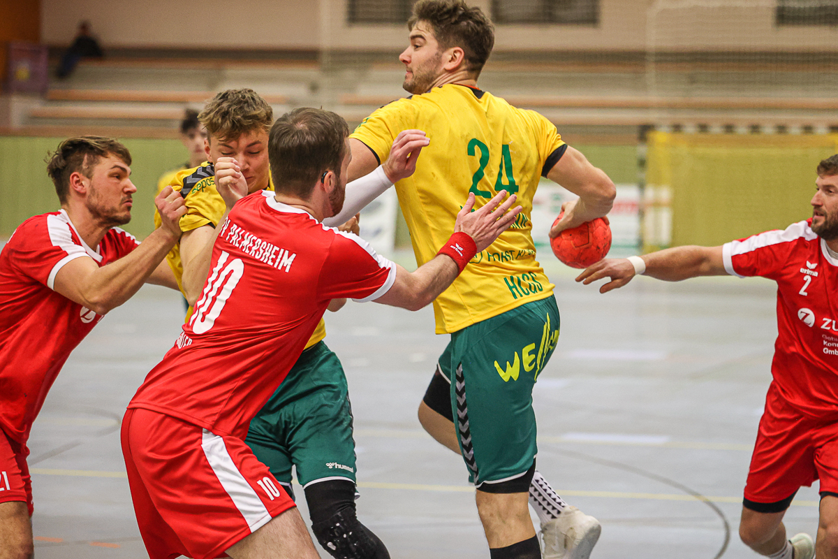 [Mit seiner Deckung war HC-Trainer Markus Murfuni sehr zufrieden. Hier stoppt Florian Panske den Palmersheimer Clemens Mäser.]