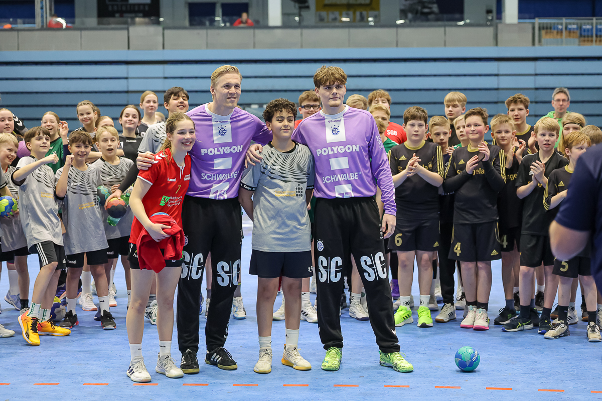 [Für die zehnte Auflage in der SCHWALBE arena hatten sich die Organisatoren etwas einfallen lassen: Die beiden VfL-Torhüter Bertram Obling und Anel Durmic waren in der Mittagspause zu Gast und traten zum Siebenmeterduell gegen die Schüler an.]