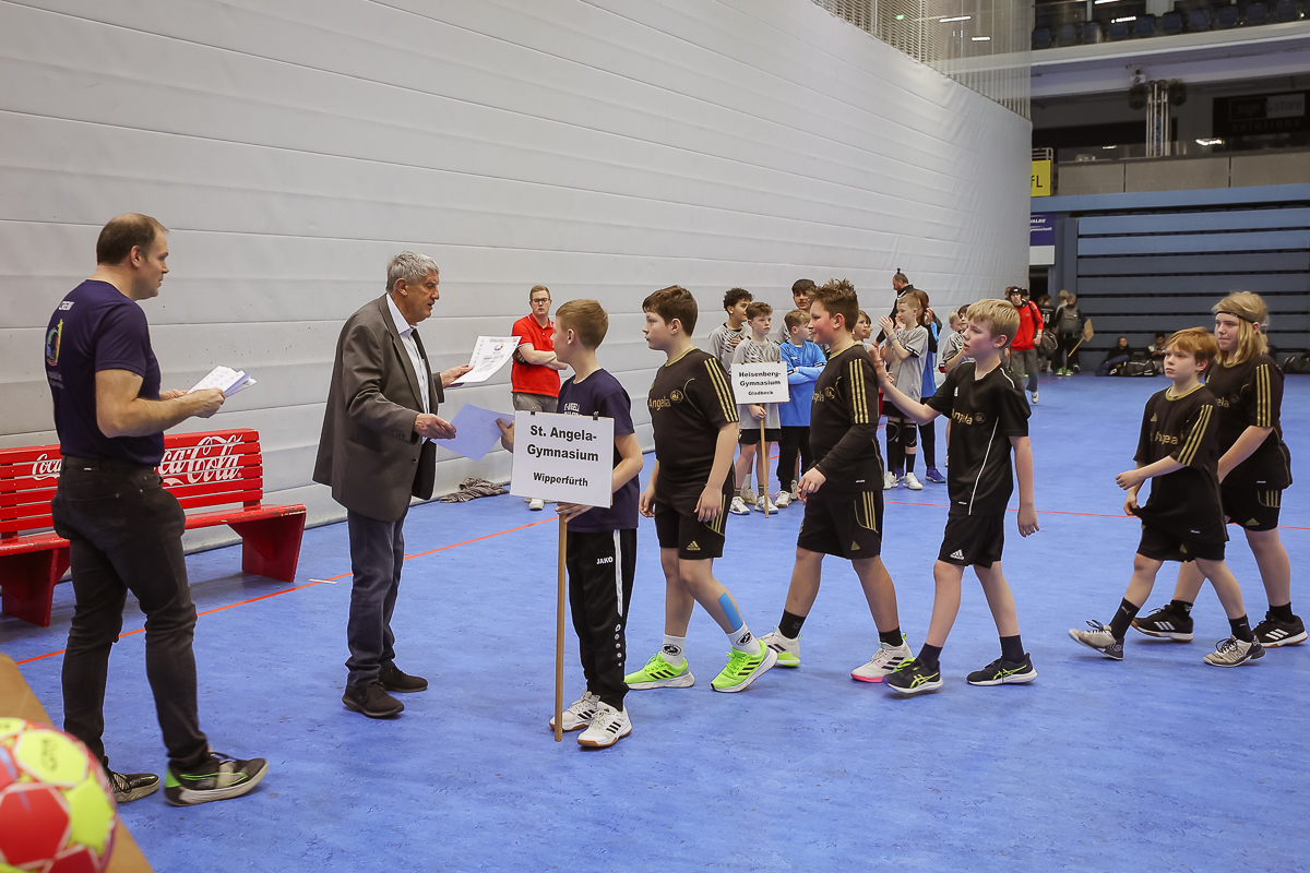 Viel Lob gab es nicht nur von Denkewitz für den Ausrichter und die Kulisse in der SCHWALBE arena, die nach einem Jahr Pause zum zehnten Mal Veranstaltungsort des Turniers war. Mehrere Schulen waren mit Bussen gekommen und hatte neben Schülern auch Eltern mitgebracht, die für eine tolle Stimmung auf beiden Spielfeldern sorgten. Für das Catering und den Sanitätsdienst war erneut die Gesamtschule Marienheide verantwortlich, obwohl sich kein Team qualifiziert hatte. Auch der ehemalige Schulleiter Wolfgang Krug ließ es sich nicht nehmen, in Gummersbach vorbeizuschauen.