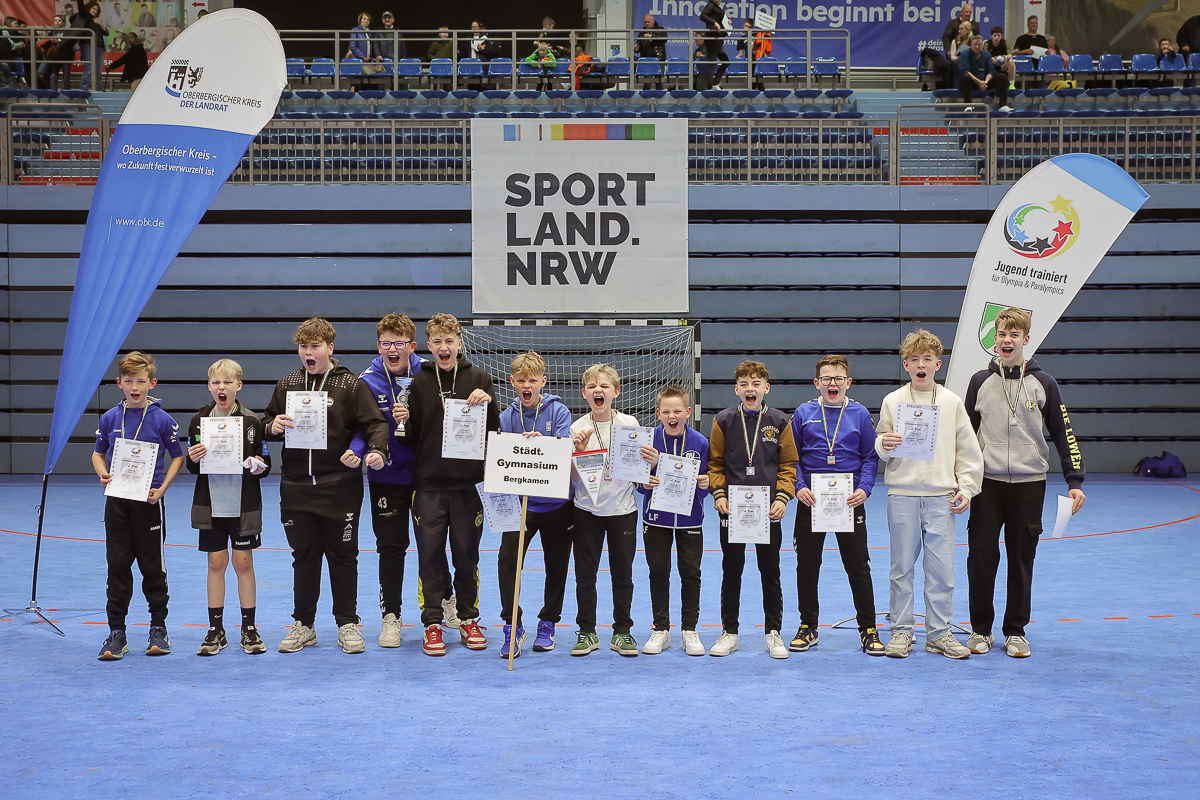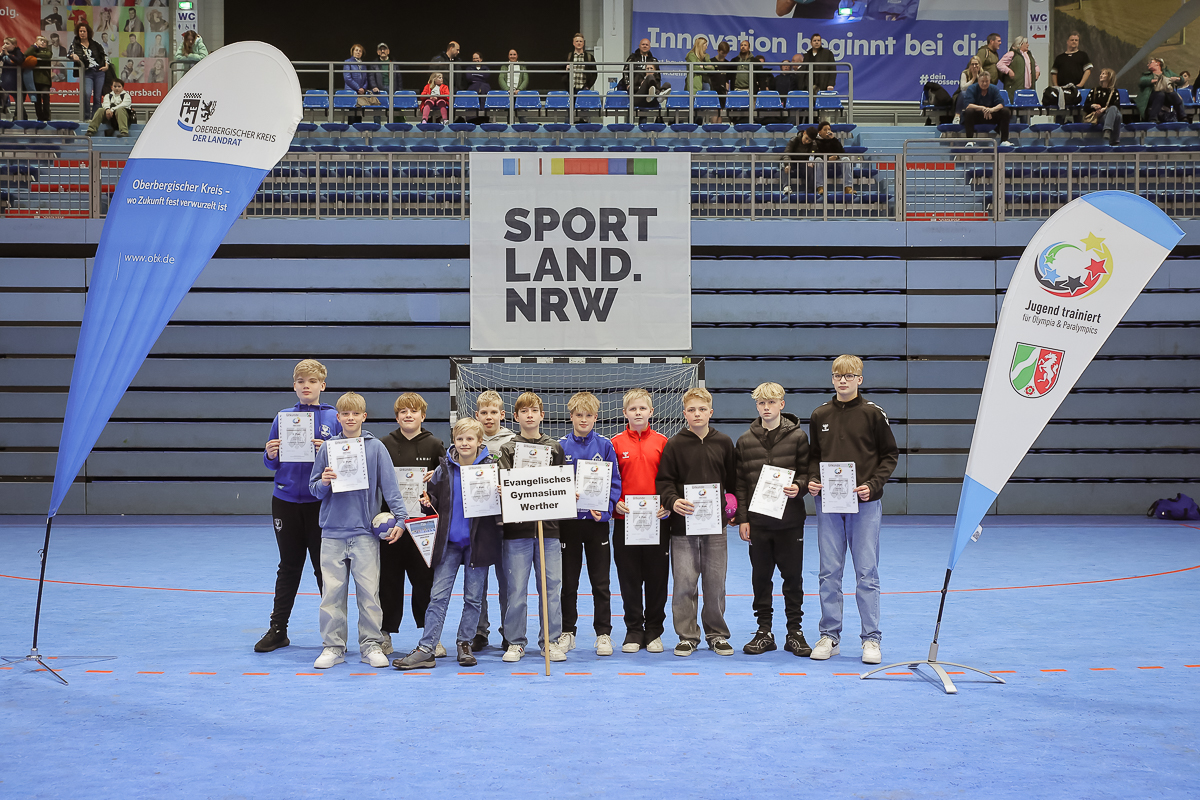 Die Siegerehrung übernahmen der stellvertretende Landrat Dr. Friedrich Wilke, Andreas Schmiegel (Staatskanzlei Düsseldorf, Schulsport NRW), Reiner Pfesdorf (Vorsitzender des Kreis-Schulsportausschusses), Bärbel Nohl (Schulamt OBK) sowie die beiden VfL-Spieler Tom Koschek und Patrick Kiesewalter.