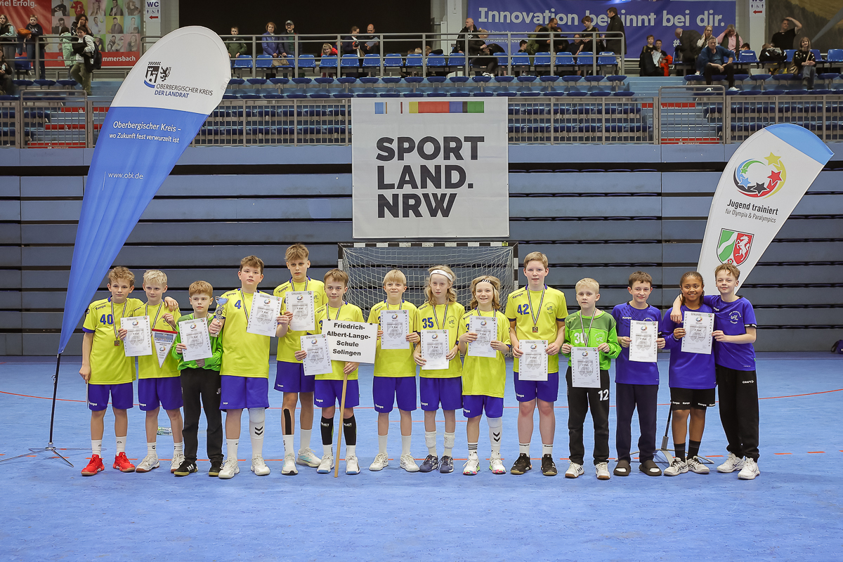 [Bereits am Vormittag fand ein Turnier der Grundschulen in der SCHWALBE arena statt. Die GGS Müllenbach freute sich über den von der Sparkasse Gummersbach gestifteten Siegerpokal. Zweiter wurde die GGS Oberwiehl, vor der GGS Körnerstraße und der GGS Niederseßmar.]