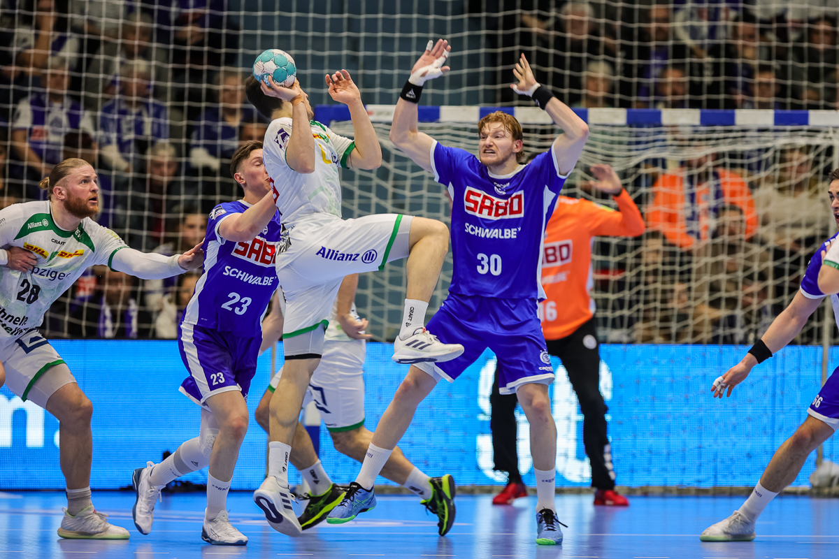 Rückraum rechts: Kai Häfner (TVB Stuttgart), Renars Uscins (TSV Hannover-Burgdorf), Franz Semper (SC DHfK Leipzig), David Schmidt (Frisch Auf Göppingen)