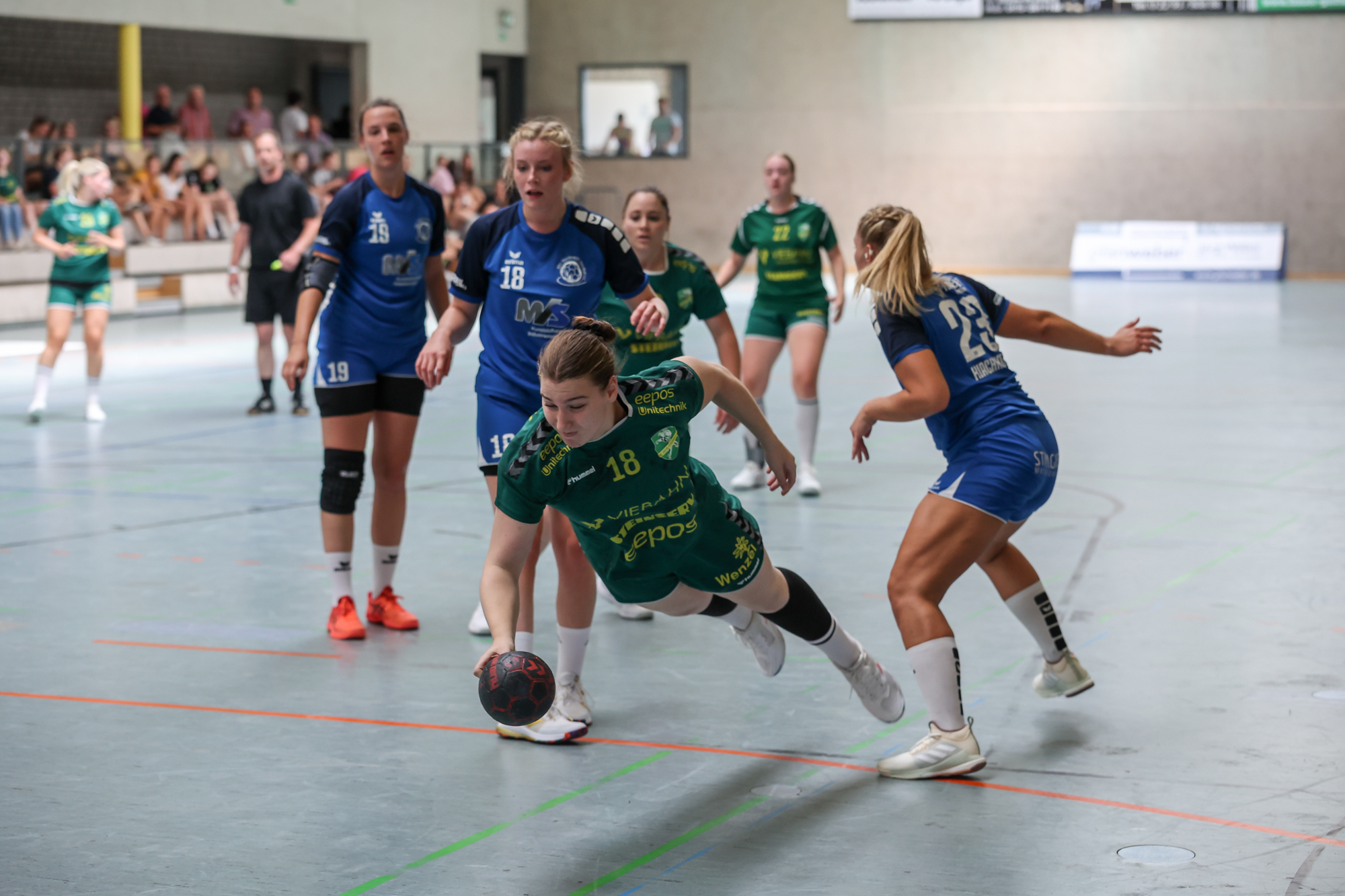 Eine Viertelstunde Anlaufzeit benötigte der SSV Nümbrecht, um den Unterschied zwischen Regionalliga Nordrhein und Landesliga Westfalen auf das Parkett zu bringen. Bis zum 8:7 (16.) hielt das Team aus dem Siegener Umland sehr gut mit, vor allem Nele-Marie Kolb war ein steter Unruheherd für die Nümbrechter Defensive. Erst nach einer Abwehrumstellung bekamen die Oberbergerinnen, deren Kader noch kleiner als am Sonntag in der Vorrunde war, mehr Zugriff auf das Spiel und bauten ihren Vorsprung über 12:8 (22.) auf 17:10 zur Pause aus.