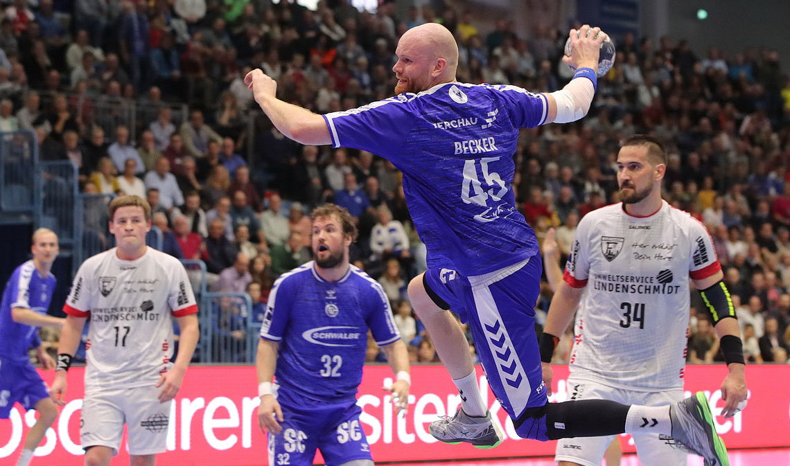 Der Spielverflauf ist schnell erzählt. Die giftigen Hausherren legten einen bemerkenswerten Start (5:2/10.) hin und ließen sich auch durch die zwischenzeitlichen Anschlusstreffer zum 8:7 beziehungsweise 9:8 nicht irritieren, blieben in der Spur und behaupteten zur Pause eine komfortable 15:12-Führung. Als Greve dann die Deckung umstellte, und Yonatan Dayan auf die Spitze einer 5:1-Formation beorderte, kam Blau-Weiß beim 16:15 wieder ins Geschäft. Jetzt reagierte freilich auch SG-Coach Hannes Jönsson und brachte den siebten Feldspieler. Mit Erfolg: Die Hallenherren enteilten auf 22:18 (41.) und ließen auch im Schlussdrittel des Matches nicht mehr vom Erfolgsweg abbringen.