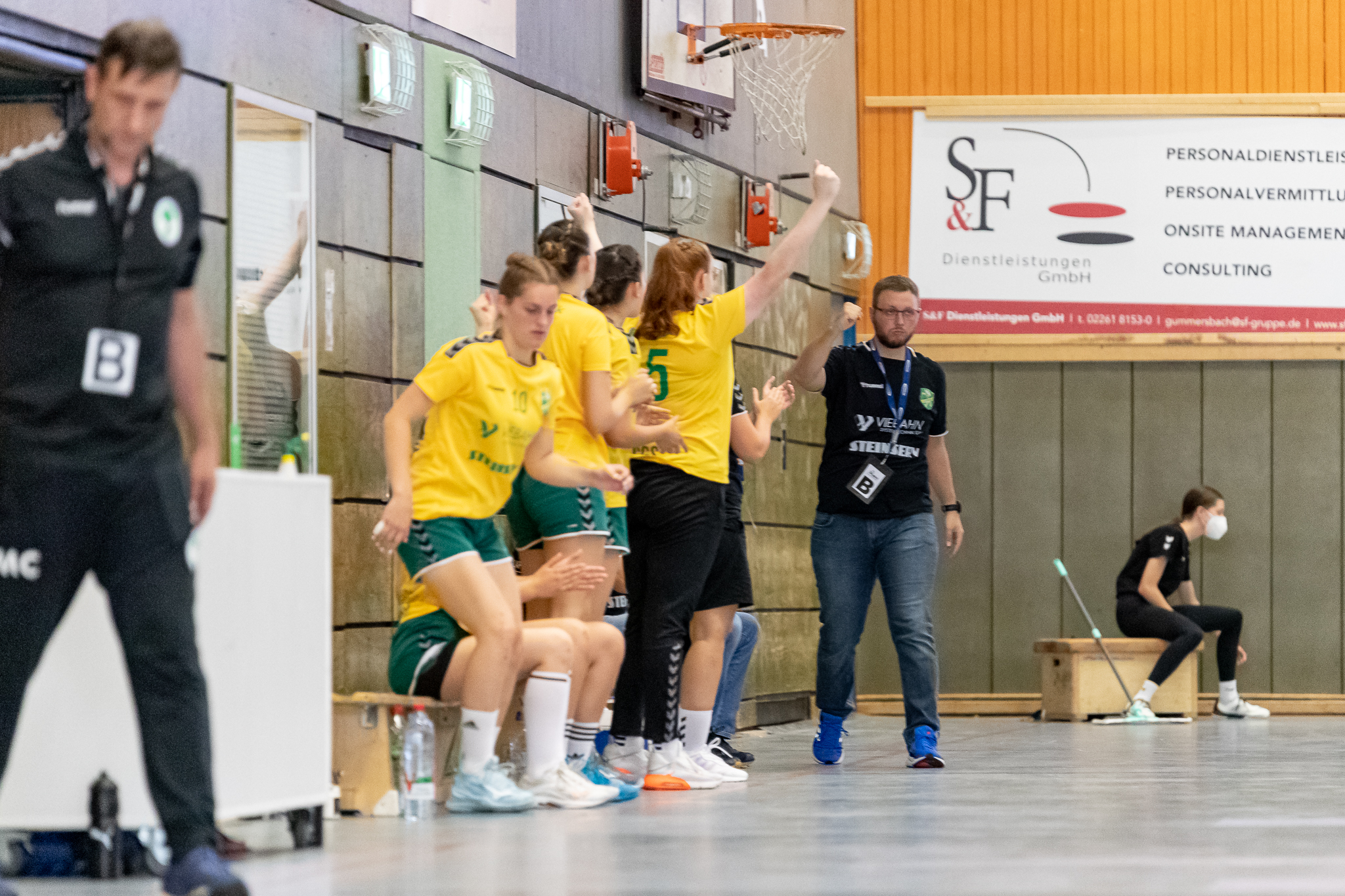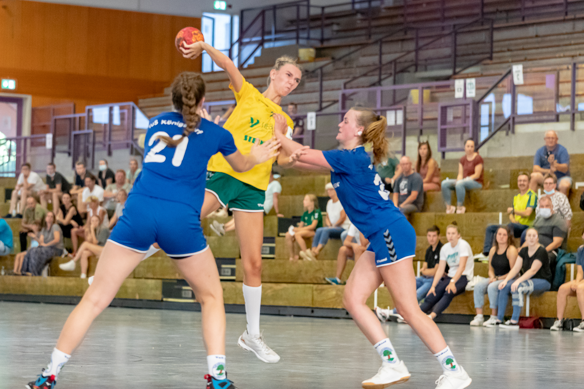 Die Gäste wussten das allerdings nur bis zum 3:6 (9.) zu nutzen. Über 9:8 (18.) und 11:14 (28.) blieb der HC stets in Schlagdistanz, mit dem Pausenpfiff gelang der erneut überragenden Lara Schmalenbach sogar noch ein direktes Freiwurftor aus zwölf Metern. Ein ganz anderes Bild nach dem Seitenwechsel. Das HC-Trainerteam Remmers/Debnar zog Schmalenbach in den Rückraum und hatte auch die richtige taktische Antwort auf die Manndeckung gegen die gut aufgelegte Celine Blumberg. „Auch defensiv waren wir wesentlich galliger“, so Remmers, dessen Mannschaft nun fünf Tore in Folge zum 18:14 (35.) markierte. Beim 27:22 (50.) war das Spiel gefühlt bereits entschieden, Königsdorfs Trainer Marian Cirloganescu zog mit einer offensiven Deckung aber den letzten Joker.