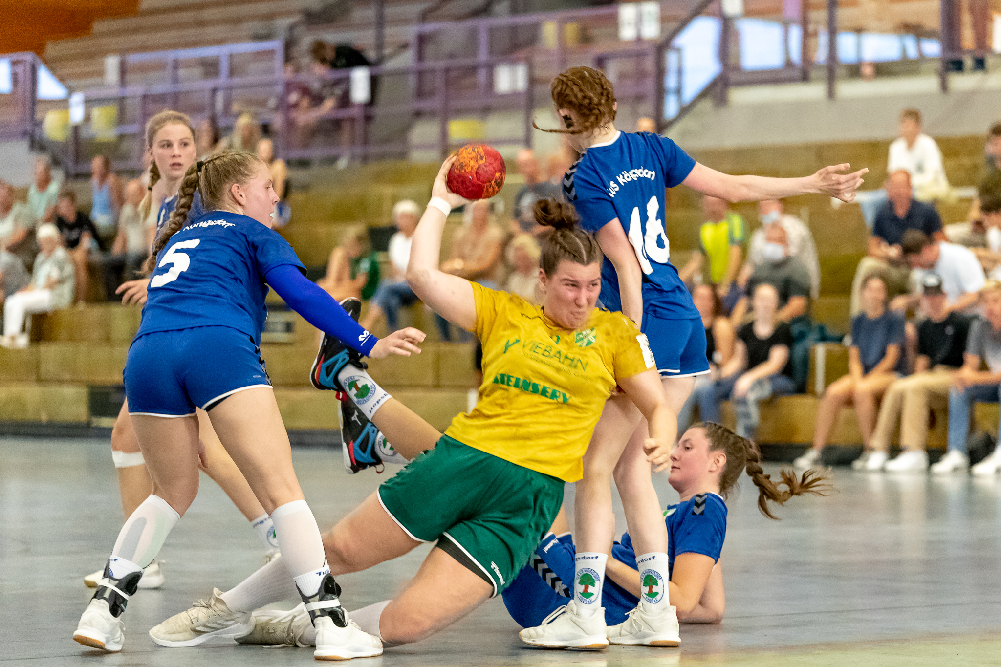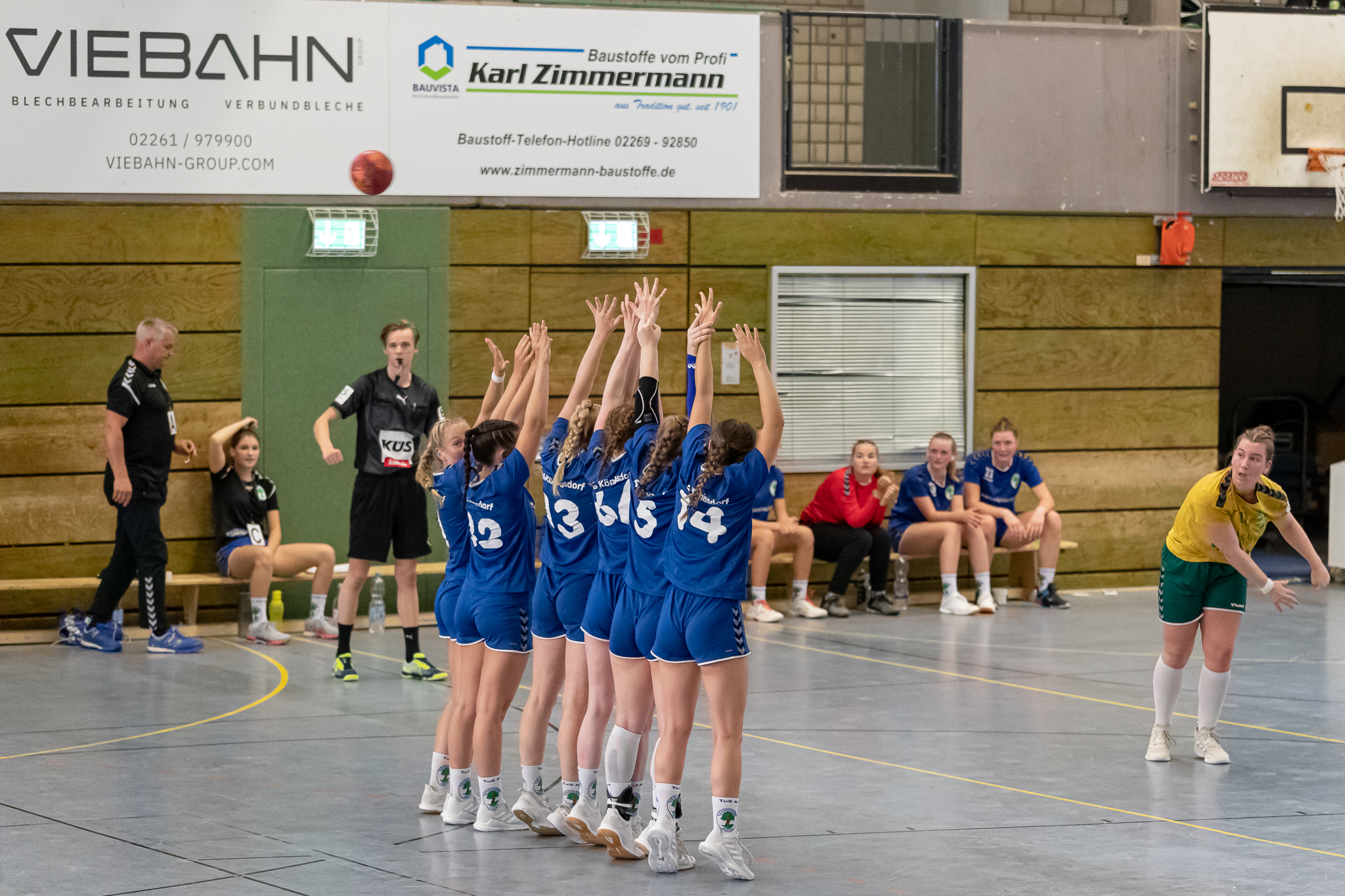Noch vor einer Woche herrschte große Skepsis beim Nachwuchs des HC Gelpe/Strombach. Doch nach zwei Spielen in der Qualifikation zur Jugend-Bundesliga ist diese plötzlich zum Greifen nah. In einem hochemotionalen Duell gegen den favorisierten TuS Königsdorf sicherte sich die Mannschaft von Ole Remmers die nächsten beiden Punkte. „Wir haben ein richtiges gutes Teamgefühl in diesen beiden Spielen entwickelt“, meinte der Coach am Morgen nach dem Erfolg. Dabei waren die Anfangsminuten gar nicht nach dem Geschmack des akribischen Handballlehrers. In der Deckung fehlte im ersten Durchgang die nötige Galligkeit und der Zugriff auf das gegnerische Spiel, offensiv machte die Mannschaft da weiter, wo sie am Mittwoch aufgehört hatte: Viele Pass- und Fangfehler zeigten erneut, dass die zehnmonatige Pause an den jungen Handballerinnen nicht spurlos vorbeigegangen ist.