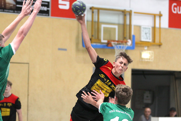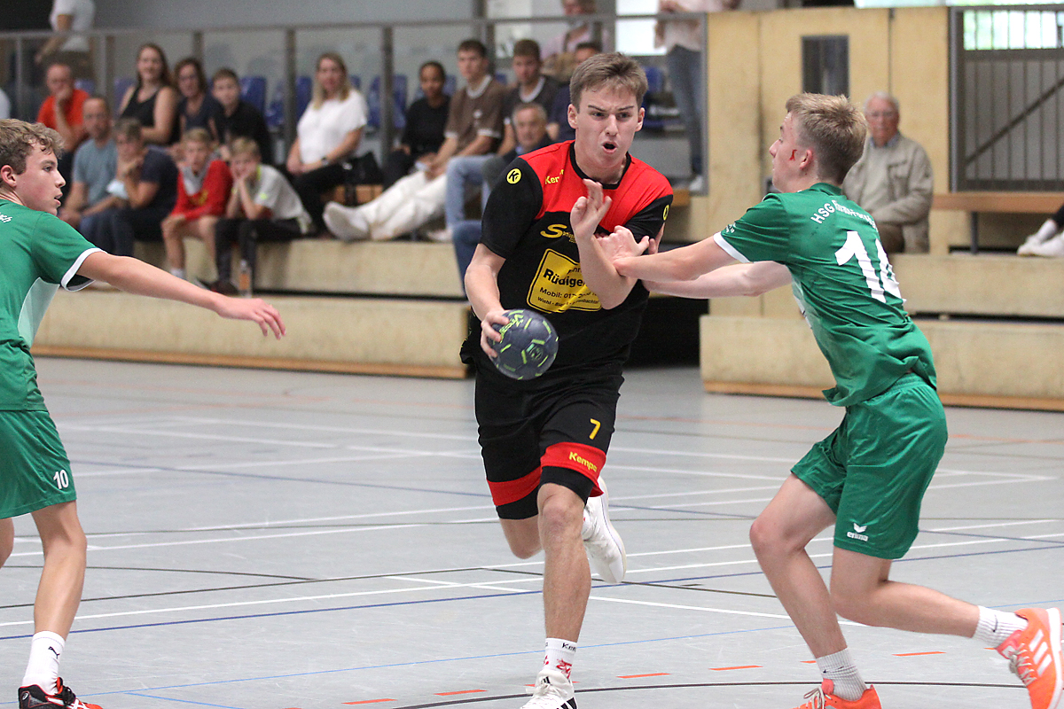 Nach der bereits in der Vorwoche gesicherten Regionalliga-Qualifikation entschied die HCGS-A-Jugend nun auch das Spitzenspiel gegen Dormagen für sich. In einem stets engen Spiel, das erst verspätet angepfiffen wurde, nachdem die angesetzten Schiedsrichter nicht erschienen waren, konnte sich kein Team entscheidend absetzen. Nach dem 3:3 (6.) übernahmen die Gäste, die ausschließlich mit den starken B-Jugendspielern aufliefen, die Führung, erst beim 11:11 (22.) glich der stark aufspielende Jakob Hardt wieder aus. Bis zur Pause blieb die Partie ausgeglichen, auch weil Lars Rostalski auf der Kreisposition immer wieder freigespielt wurde.