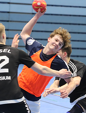 Waren die Jodocus-Nünning-Gesamtschule aus Borken (22:5-Sieg) und die Friedrich-Harkort-Schule aus Herdecke (24:11) noch dankbare Auftaktgegner, entwickelte sich das dritte Gruppenspiel gegen das Carl-Fuhlrott-Gymnasium aus Wuppertal zum echten Hitchcock. Das oberbergische Team führte bereits deutlich, geriet in der Schlussphase aber doch noch mit 10:11 in Rückstand. Schulleiter Wolfgang Krug sollte nach dem Turnier von der mentalen Stärke seiner Schüler schwärmen und auch Möller attestierte seiner Mannschaft starke Nerven: „Sie war fokussiert und mit dem Kopf da. Das fehlte bei den letzten Anläufen.“ Letztlich wurde das Spiel knapp mit 12:11 gewonnen, die Entscheidung brachte aber erst das finale Gruppenspiel gegen das Besselgymnasium aus Minden.