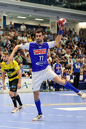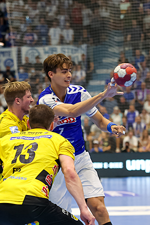 Zunächst saß der Shooter allerdings nur auf der Bank. Denn entgegen seiner Ankündigung unter der Woche, rotierte Sigurdsson gewaltig durch und begann mit Fynn Herzig und Timm Schneider im Rückraum. Die Anfangsminuten gehörten indessen Raul Santos, der mit drei Toren maßgeblichen Anteil an der schnellen 6:2-Führung (6.) hatte. Coburg erwies sich aber als der erwartet hartnäckige Gegner und glich zum 6:6 (11.) aus. In der zwölften Minute war es dann soweit: Unter großem Applaus kam Köster in die Partie und bediente sofort Herzig zum 8:6 (13.). Überhaupt zeigte Herzig seinem neuen Arbeitgeber aus Coburg, worauf er sich kommende Saison freuen darf und machte ein starkes Spiel.