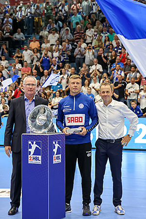Um 20:11 Uhr war es soweit: HBL-Geschäftsführer Frank Bohmann und Ligapräsident Uwe Schwenker überreichten VfL-Kapitän Timm Schneider vor 3.604 Zuschauern in der SCHWALBE arena die Meisterschale der 2. Handball-Bundesliga. Bereits am 33. Spieltag hatte der oberbergische Traditionsverein mit einem 34:26-Auswärtssieg in Bietigheim die Rückkehr in die Bundesliga perfekt gemacht. Zum Abschluss der Saison wahrte das Team von Trainer Gudjon Valur Sigurdsson zudem seine weiße Heimweste und blieb mit dem hart erkämpften 29:27-Erfolg über Coburg auch im 19. Spiel in eigener Halle ungeschlagen.