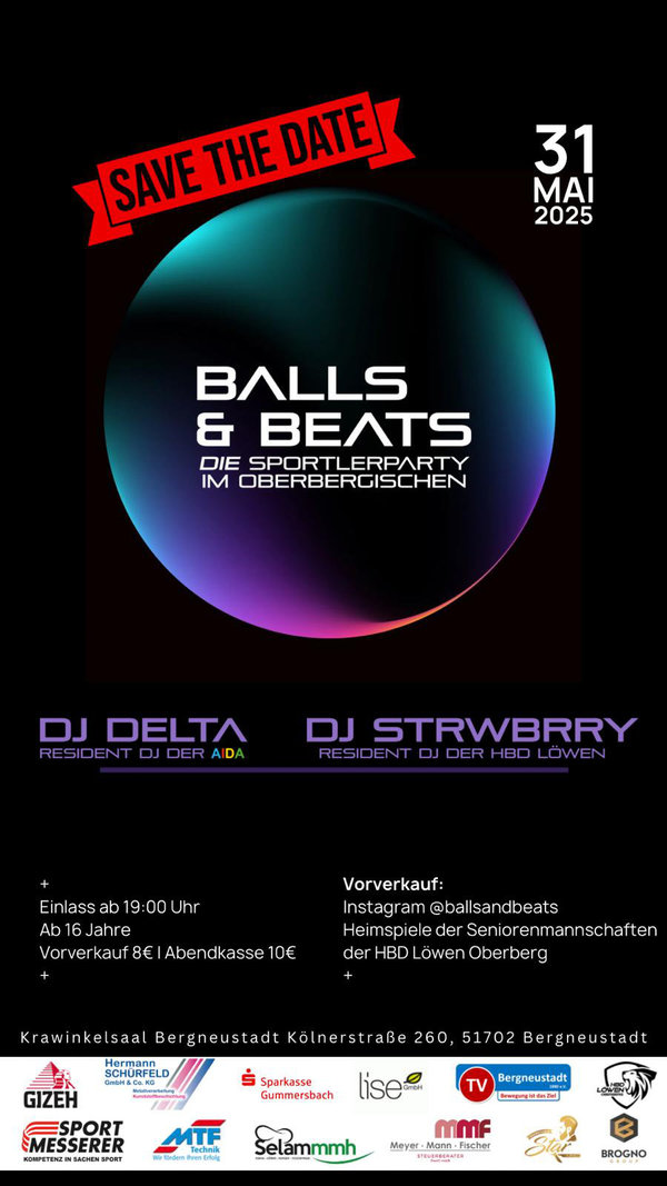 Die HBD Löwen Oberberg feiern am Samstag, 31. Mai, im Bergneustädter Krawinkelsaal unter dem Motto „Balls & Beats – Tanz aus dem Mai“ statt.DJ Delta und DJ Strawberry werden für Stimmung auf der Tanzfläche sorgen. An dem Abend sind auch einige Überraschungen geplant. Los geht‘s ab 19 Uhr. Ticketvorverkauf für 8 Euro pro Stück auf Instagram (@ballsandbeats.de) oder bei Sebastian Draeger (Tel.: 01575/79 67 979). An der Abendkasse kostet der Eintritt 10 Euro.