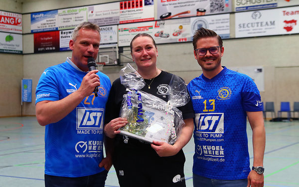 [V.l: Jörg Weber (2. Vorsitzender), Martina Duckart, Mario Jatzke (1. Vorsitzender). Schon vor dem offiziellen Abschied flossen bei Martina Duckart die Tränen. Acht Jahre war die Nümbrechter Trainerin im Amt und verabschiedete sich nun mit dem Klassenerhalt in der Regionalliga.]