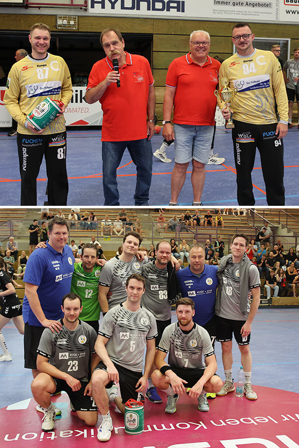 [Über eine kleine Bier-Präme vom namensgebenden Pokalsponsor durften sich beide Teams freuen, die beiden Löwen-Keeper Andreas Gutsmuths (li.) und Nico Bussmann (r.) nahmen zudem den Pokal in Empfang.]