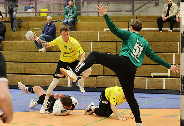 Die Zuschauer in der abermals gut gefüllten GWN-Arena erlebten zunächst 30 Minuten Hochgeschwindigkeitshandball. Angesichts des wahnwitzigen Tempos blieb zum Durchatmen kaum Zeit. Bis zum 9:7 (15.) mit leichten Vorteilen für Nümbrecht. Anschließend kippte das Match aber zum 11:13 (23.) und es ging mit einem 17:19-Rückstand aus oberbergischer Sicht in die Kabinen. Im zweiten Durchgang änderte sich die Statik der Partie. Weiden erhöhte zunächst zum 18:22 (36.), ehe Seinsche sein Team mit einer Auszeit wieder ins Spiel brachte. Beim 25:25 (48.) fiel der Ausgleich. Längst war die Partie nun defensivgeprägter, auch die beiden Torhüter waren nun Faktoren. Die Schiedsrichter hatten alle Hände voll zu tun und pfiffen insgesamt 19 Siebenmeter (8:11).
