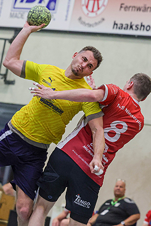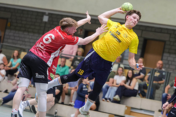 Gegen den starken Aufsteiger aus dem Kölner Umland dauerte es allerdings einige Zeit, bis die Oberberger ins Spiel fanden. Über 3:5 (7.) und 7:9 (15.) lief man lange einem Rückstand hinterher und musste zudem in der 24. Minute die rote Karte von Philipp Borisch verdauen, der seinen Gegenspieler am Hals erwischt hatte. Doch schon kurze Zeit später machte der ATV aus einem 10:12-Rückstand eine 13:12-Führung (27.). Mit einem 15:15-Remis ging es anschließend in die Kabinen. Nach dem Seitenwechsel arbeitete sich Hückeswagen vor allem defensiv mehr und mehr in das Spiel und hatte mit Niels Kuhlwilm zudem einen starken Keeper zwischen den Pfosten.