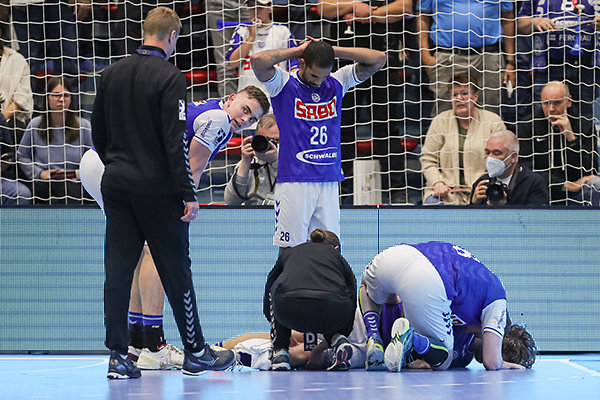 [Nach einem Tempogegenstoß sackte Timm Schneider zusammen. Er habe bei der Landung einen Stich im Knie gespürt, sagte der VfL-Kapitän nach dem Spiel.]