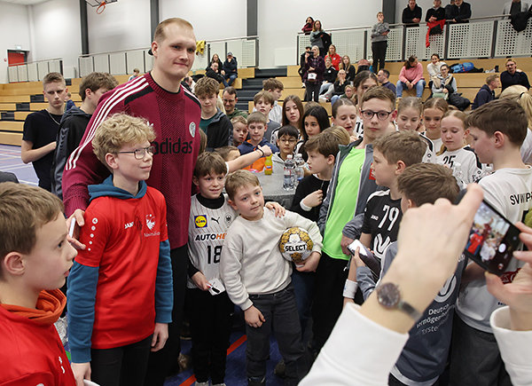 Zum Abschluss nahm sich der Nationalkeeper viel Zeit für Autogramme, Fotos und Selfies. Geduldig schrieb er auf Trikots, Bälle und Autogrammkarten – und erfüllte damit viele kleine Handballträume. So wurde der Abend in der Voss-Arena weit mehr als nur ein Interviewtermin.