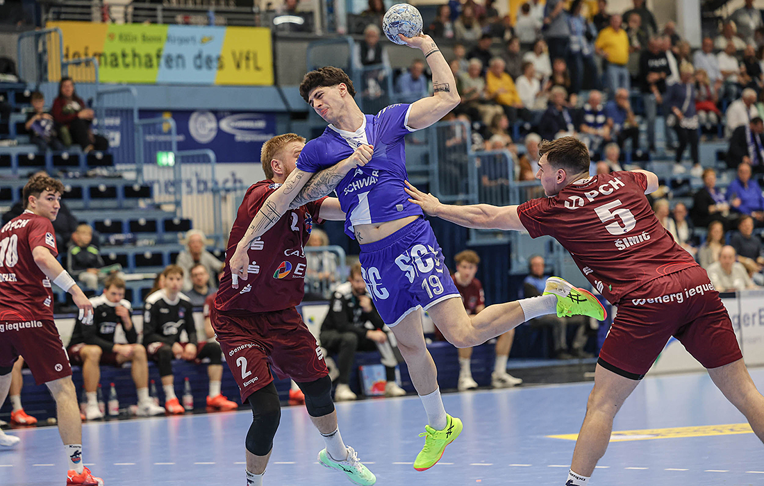 Der Abend hatte aus oberbergischer Perspektive bereits erfreulich angefangen. Die Fans hatten jedenfalls schon vor dem Anwurf dreifach Gelegenheit, ausgiebig zu jubeln: Die Rückkehr des wochenlang maladen Julian Kösters wurde jedenfalls euphorisch gefeiert. Und auch die erstmalige Berufung von Rechtsaußen Mathis Häseler in den Kreis der Handballnationalmannschaft wurde stürmisch beklatscht. Da passte es nur allzu gut zur allgemeinen Hochstimmung in der Arena, dass Scharfschütze seinen Miro Schluroff am Freitag seinen 25. Geburtstag feierte.