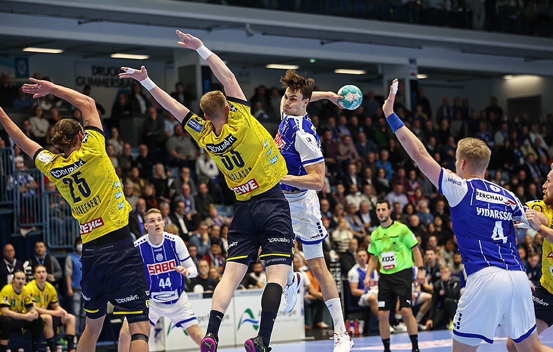 Doch die Gäste zeigten sich mäßig beeindruckt. Sie konterten schnell zum 3:4, wobei sich schon in diesen ersten Sequenzen abzeichnen sollte, was sich im weiteren Spielverlauf verfestigte: Gummersbachs Torwart Tibor Ivanisevic lief zu ganz großer Form auf, während auf der Gegenseite Nationalspieler Juri Knorr sowohl als Torschütze (am Ende 15 Treffer) als auch als genialer Anspieler auf seinen Mitspieler und Kreisläufer Jannick Kohlbacher überragend agierte.