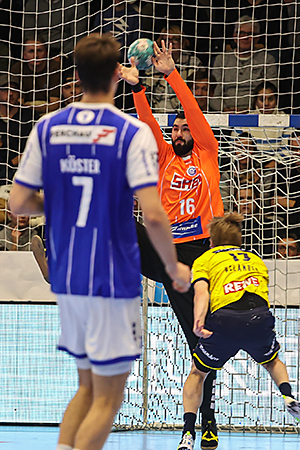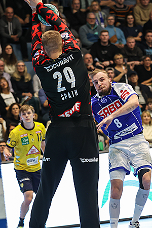 [Tom Jansen im Anflug auf den starken David Späth, der sogar auf eine Quote von 40,74 Prozent gehaltener Würfe kam.]