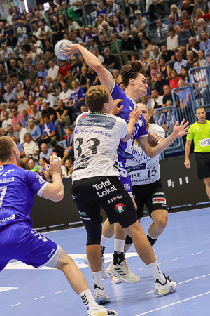 Doch spätestens mit dem Seitenwechsel übernahm Gummersbach wieder das Kommando. Tilen Kodrin und Mathis Häseler durften nun auf den Außen ran und im Tor bekam Dominik Kuzmanovic den Vorzug. Der kroatische Neuzugang und Jungspund Häseler waren auch sofort hellwach. Zwischen der Parade des Nationalspielers, dem traumhaften Pass auf den Rechtsaußen und dessen Gummihandgelenk zum 23:18 (34.) lagen nur Sekunden.