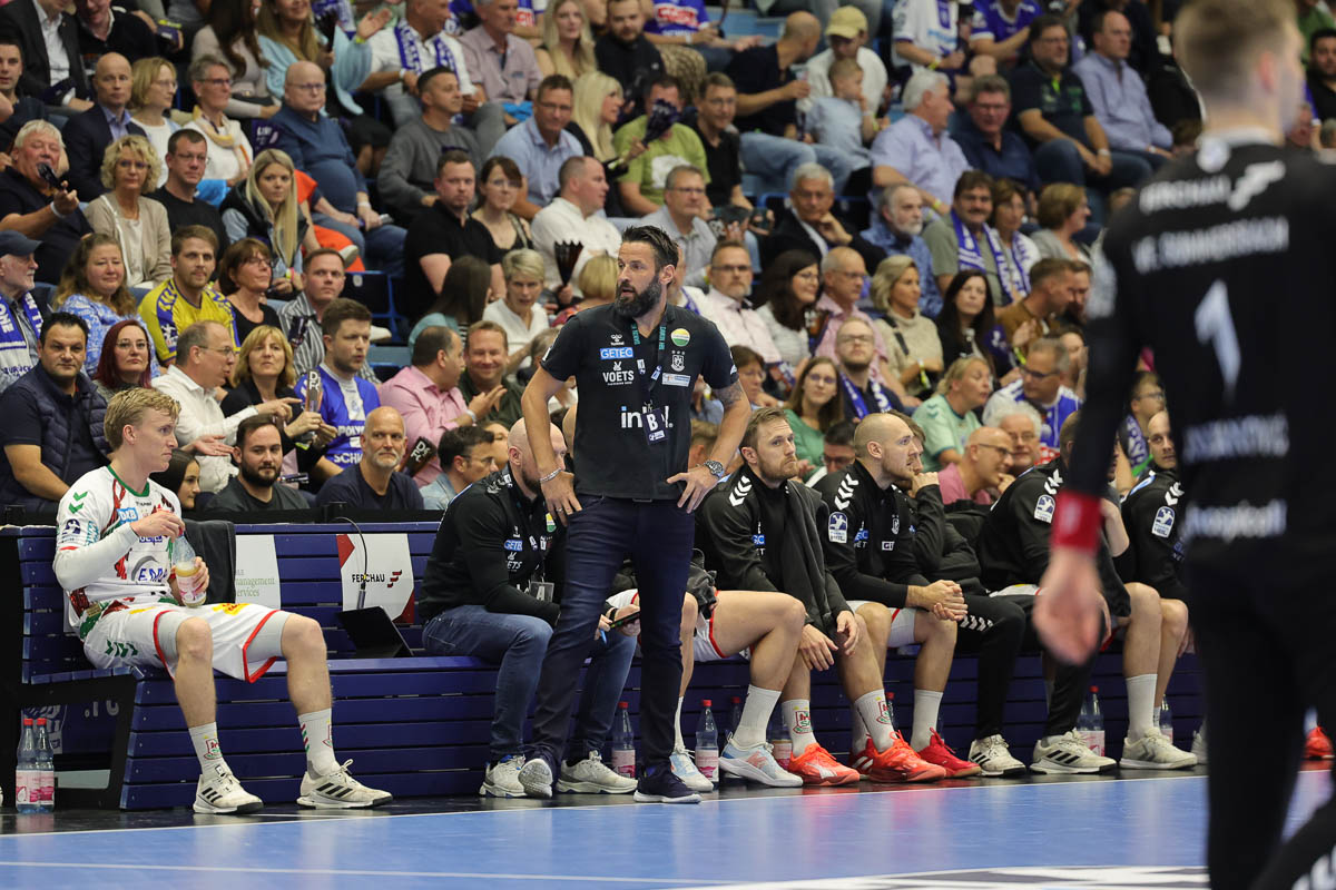 [So ruhig wie hier verfolgte Gudjon Valur Sigurdsson die (li.) 60 Minuten selten. Bennet Wiegert haderte mehrfach mit den Entscheidungen der Schiedsrichter.]