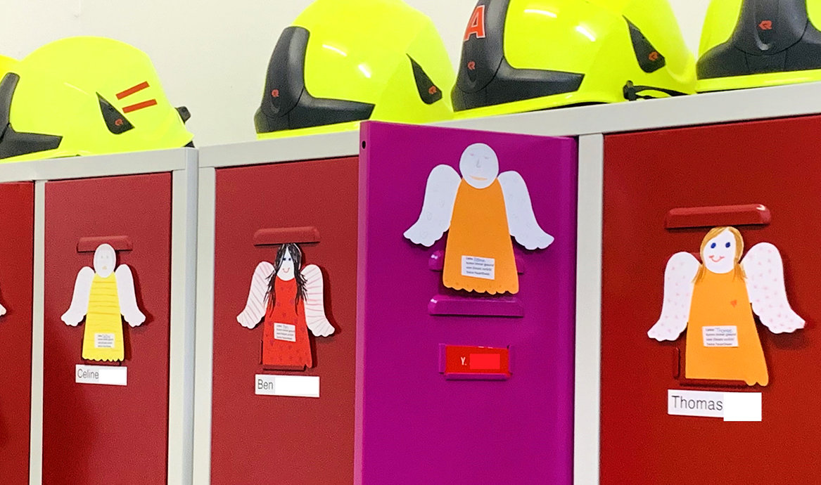 Hückeswagen – Die Kinderfeuerwehr überrascht ihre großen Vorbilder mit selbstgebastelten Schutzengeln, die fortan an den Spinden der Einsatzkräfte hängen.