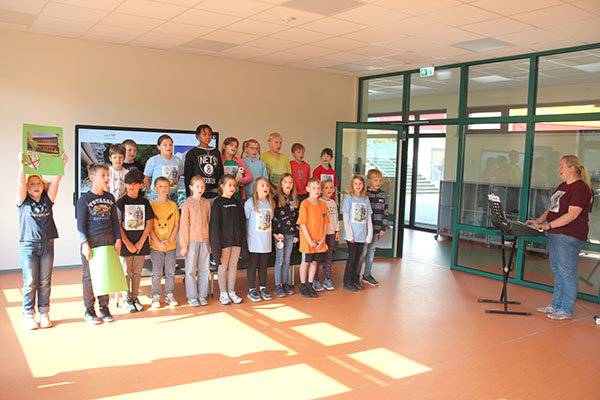 [Die Klasse 4a mit Lehrerin Ina Luckner sang drei Lieder und umrahmte die Feierstunde, an der Lehrer, Eltern, das OGS-Team, Vertreter der Stadt und des ausführenden Baubetriebs Gerhard Müller teilnahmen.]