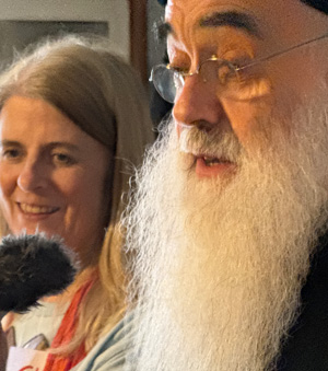 [Walter Jordan - verkleidet als Schulmeister - sprach auch in das Mikrofon von WDR 5-Mausreporterin Christina Pannhausen.]